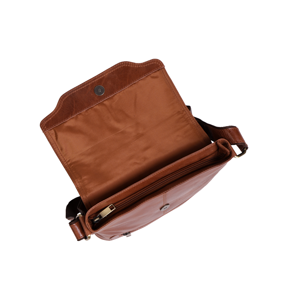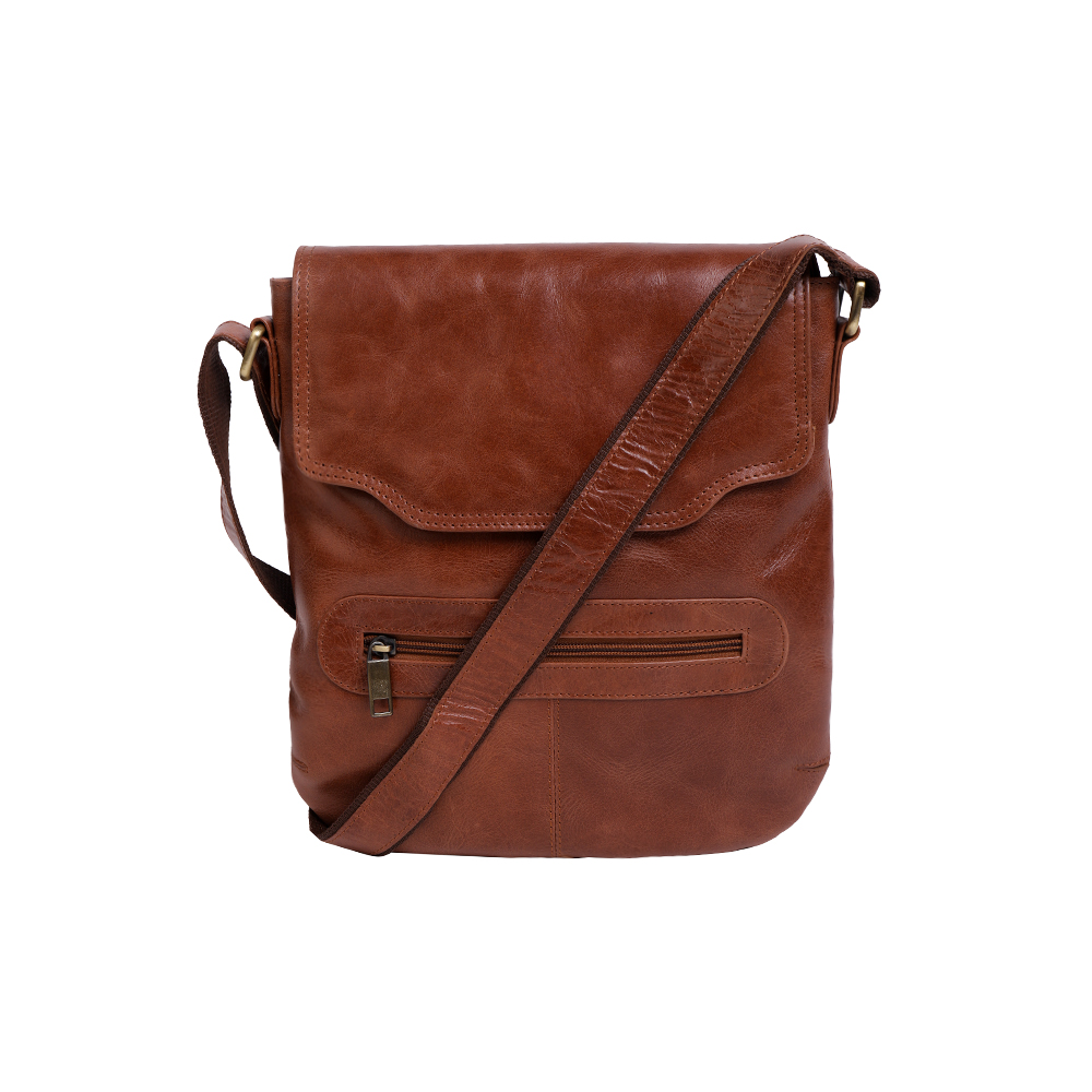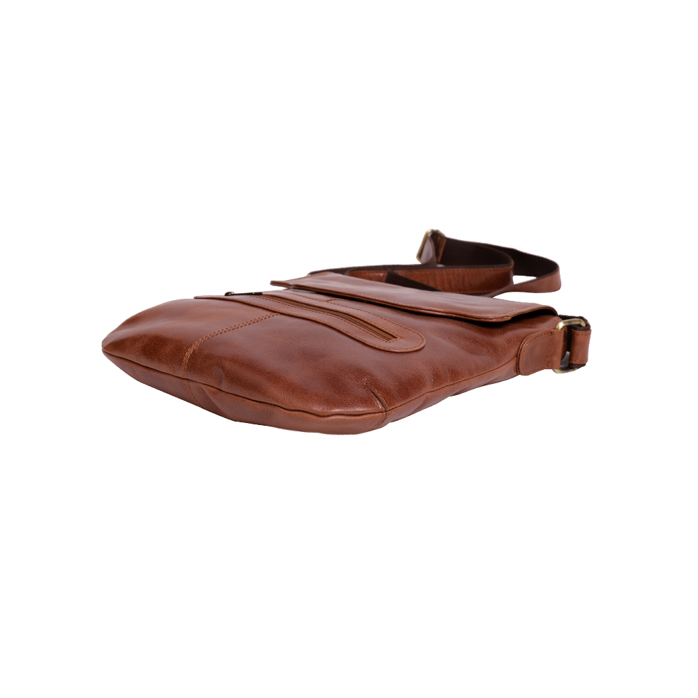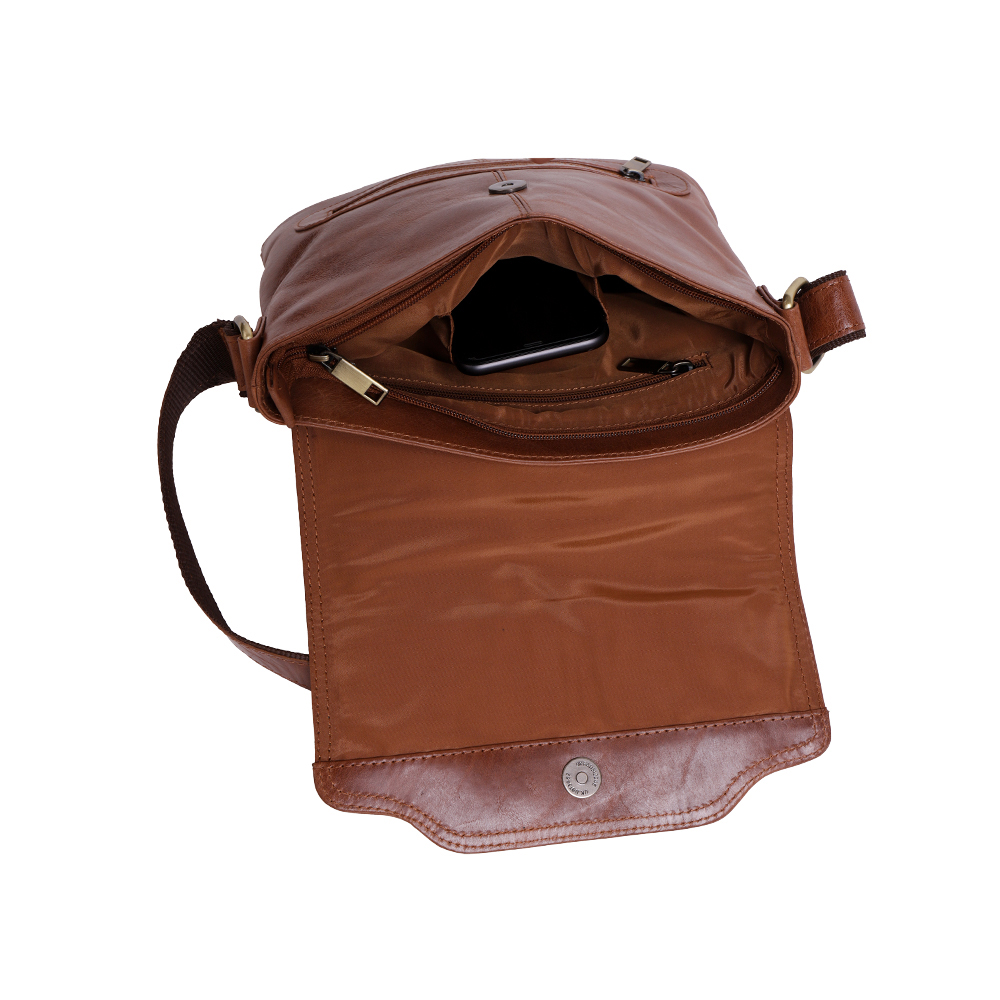 20*8*28 CM Flap From back Stitch to Front 23 CM 150 CMs ADJUSTABLE In the front zip you can slide your wallets and keys. Main well allows small note books, cell phone and small nick-nacks. Top of the bag close with separate zip and a flap which is equipped with concealed magnet. Back of this bag comes with another zip which can hold more essential items. All metallic parts are crafted in pure hardened solid brass sourced from city of MURADABAD, INDIA.size in LWH Strap Size Bag Features